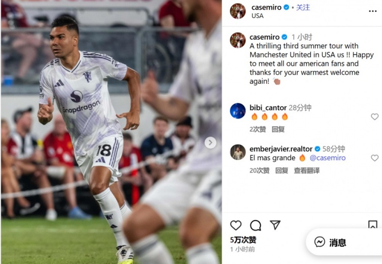 卡塞米罗写谈:“与曼联在好意思国的第三次首肯东谈主心的夏日巡回赛!很快主张到扫数好意思国球迷,感谢你们再次赐与最厉害的接待!”