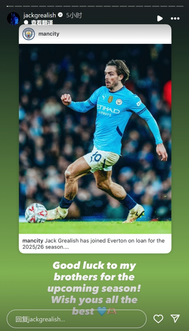 格拉利什社媒转发曼城的官宣动态,并配文:“祝我的昆玉们新赛季好运,一切奏凯!”