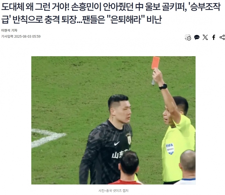 昨日的中超第19轮,成皆蓉城2-1山东泰山,王大雷下半场被红牌罚下激勉热议,韩媒Sports Chosun也温雅到了这次事件。并撰文报说念,标题为《这究竟是何如回事?孙兴慜也曾拥抱过的中国门将,却因一次可能被认定为假球的犯规被罚下场……球迷们是非袭击他,条件他退役》