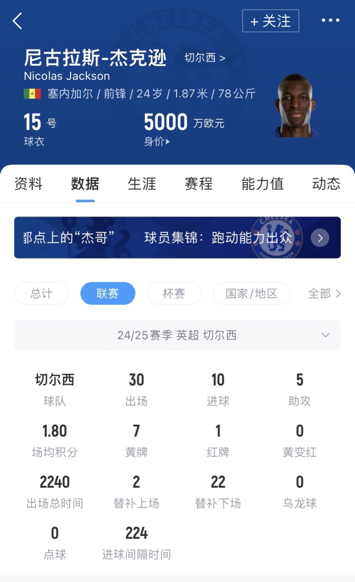 杰克逊现年24岁,现在德回身价5000万欧,切尔西2023年破耗3700万欧从比利亚雷亚尔将其引进。上赛季杰克逊为切尔西出战38场得益16球5助。