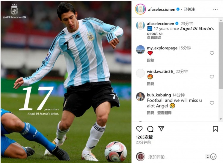 9月6日讯 阿根廷队官方更新社媒动态,总结17年前的今天迪马利亚献技国度队首秀。