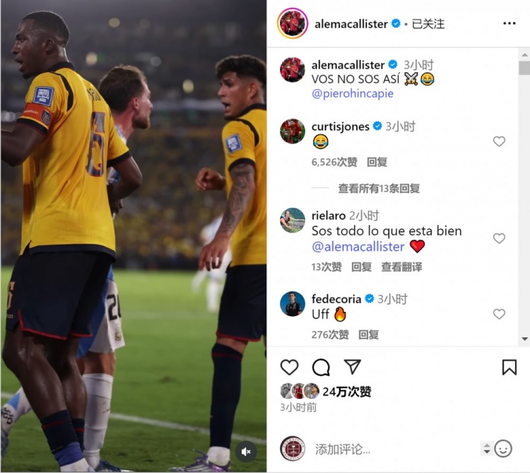 本场比赛伤停补时阶段,厄瓜多而后卫因卡皮耶禁区内龙套马斯坦托诺的契机,并寻衅这位小将,麦卡利斯特冲上来与因卡皮耶坚持并争吵。