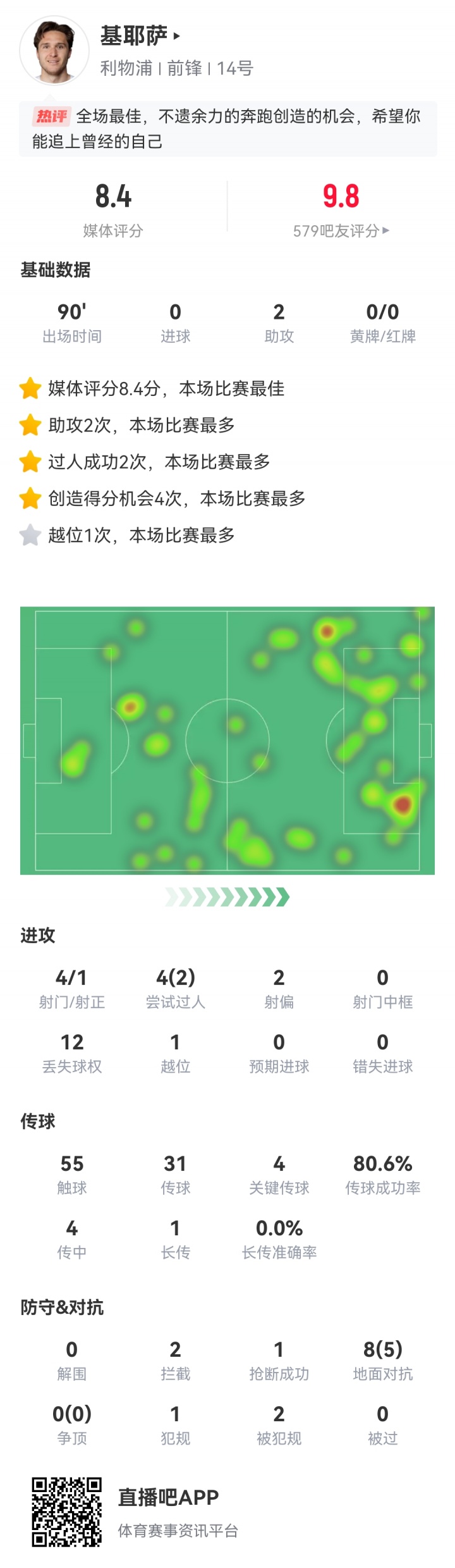 本场比赛基耶萨着实认悉数亮眼,他2次过东说念主告成并创造了4次得分契机,均为本场比赛最多。而他的两次助攻,一次是通过他的积极拼抢断球,另一次则是在丝滑停球面临门将时选用横传。