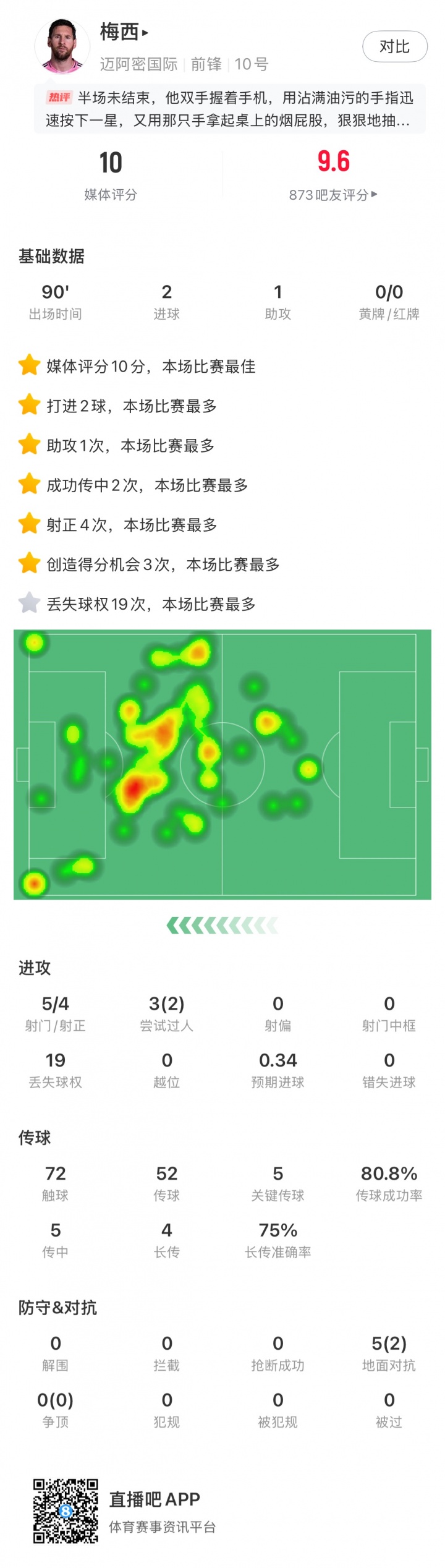 齐备进展!38岁梅西数据:2射1传,5次重要传球!评分10分