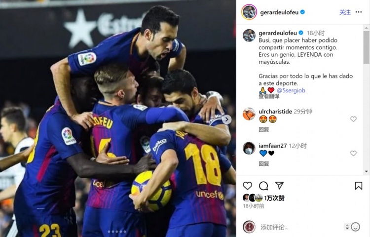 德乌洛费乌社媒晒出与布斯克茨等队友庆祝的合照,配文:“布斯克茨,很庆幸与你共度那些好意思好时代,你是天才,名副其实的外传,感谢你为这项默契奉献的一切。”
