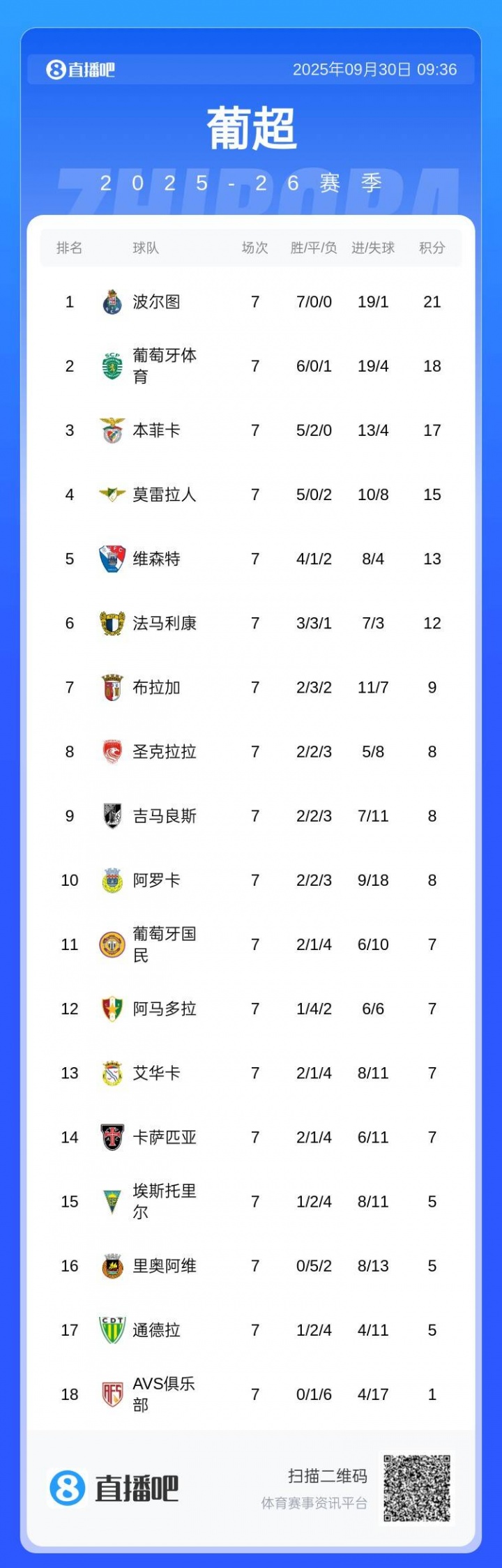 现在波尔图3分领跑葡超,排第2的是葡体。波尔图的死敌本菲卡暂时4分过时,排在第3位。下一轮葡超,便恰是葡萄牙国度德比:10月6日,波尔图vs本菲卡。