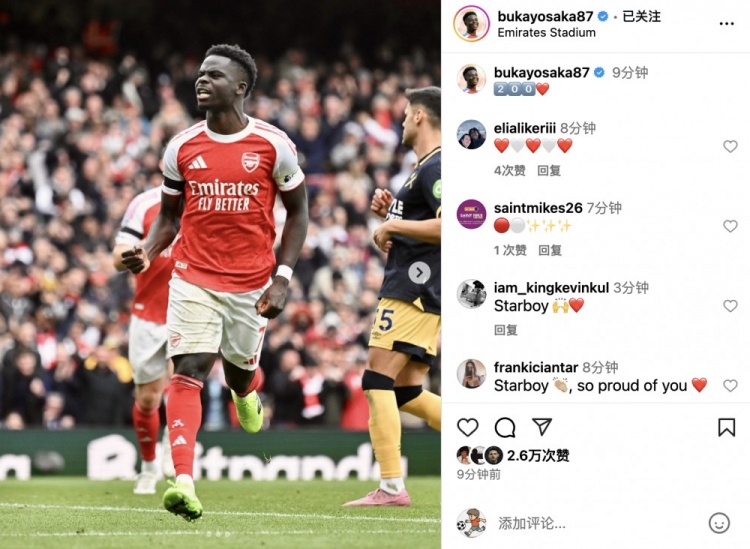 这是萨卡英超第200场里程碑之战,同期亦然萨卡英超参与进球数第100个。赛后,萨卡更新社媒晒照追思我方英超第200次出场,并配文:200场♥️