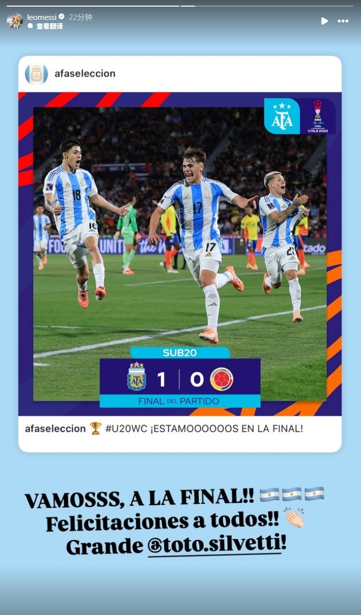 10月16日讯 今天,阿根廷U20打败哥伦比亚U20,挺进世青赛决赛,比赛收敛后,梅西在Instagram发文,恭喜了球队。