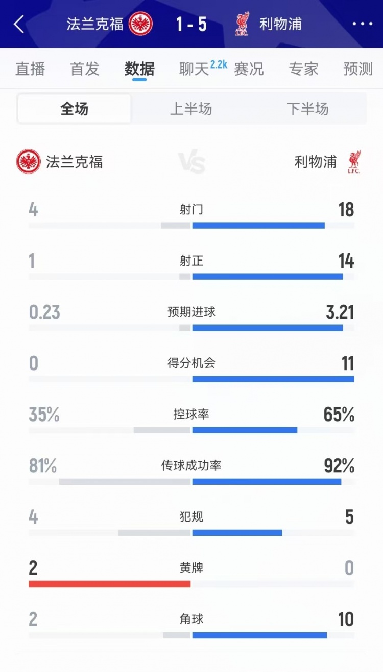 10月23日讯 本轮欧冠焦点战,利物浦客场5-1逆转法兰克福,两队全场要道数据如下:
