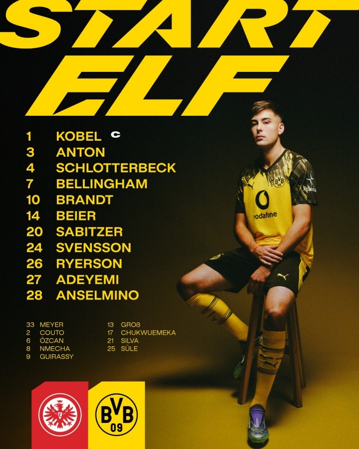 多特蒙德首发:1-科贝尔、3-安东、4-施洛特贝克、7-乔布-贝林厄姆、10-布兰特、14-拜尔、20-萨比策、24-文静松、26-莱尔森、27-阿德耶米、28-安塞尔米诺
