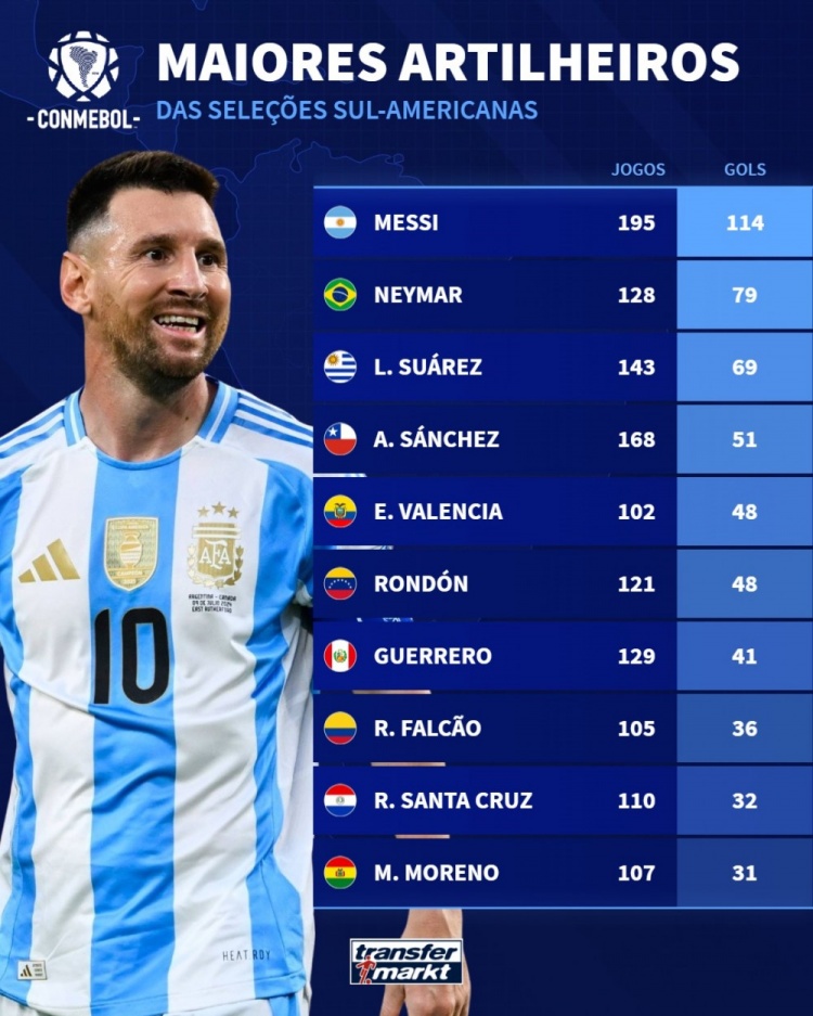 11月13日讯 德国转会商场列出了南好意思列国度队的历史弓手王,梅西、内马尔、苏亚雷斯、桑切斯在列。