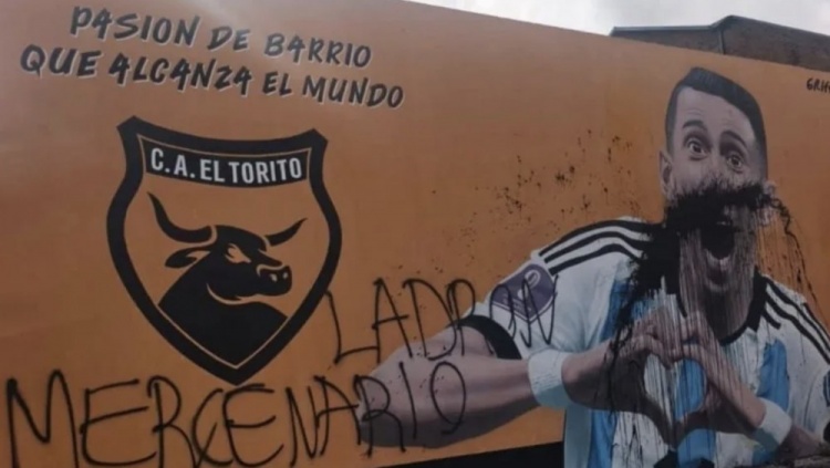 11月22日讯 据阿根廷媒体tycsports报谈,迪马利亚在罗萨里奥的一副壁画被东谈主为贬抑,还写上了“小偷,雇佣兵”等词语。
