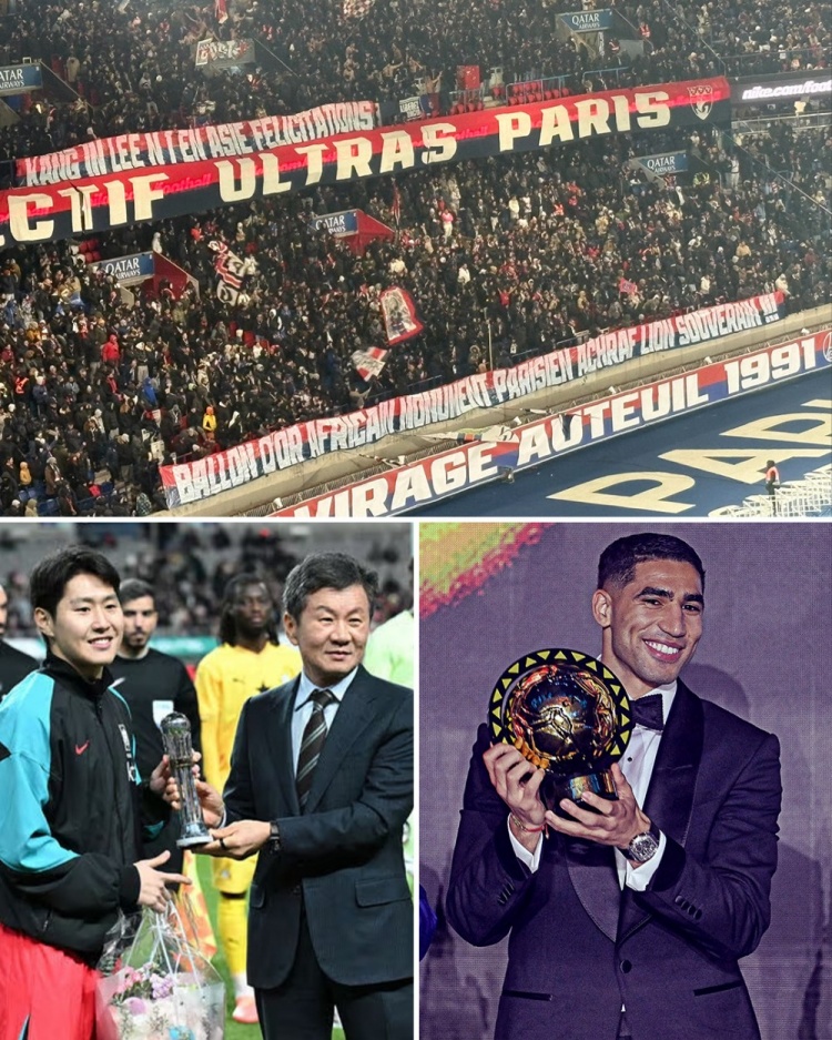 巴黎球迷此役拉出横幅,祈福李刚仁(亚足联最好外洋球员)和阿什拉夫(非洲足球先生)获奖。