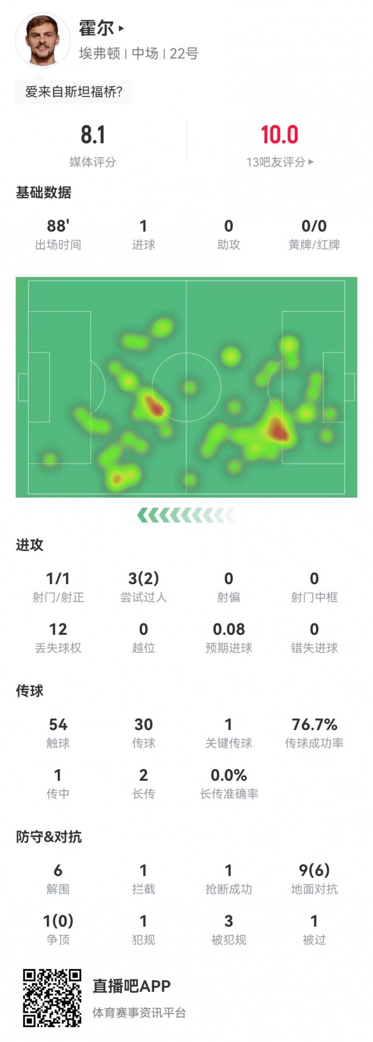 霍尔本场1球+1要津传球 6突围+3造犯规 10挣扎6收效 获评8.1分