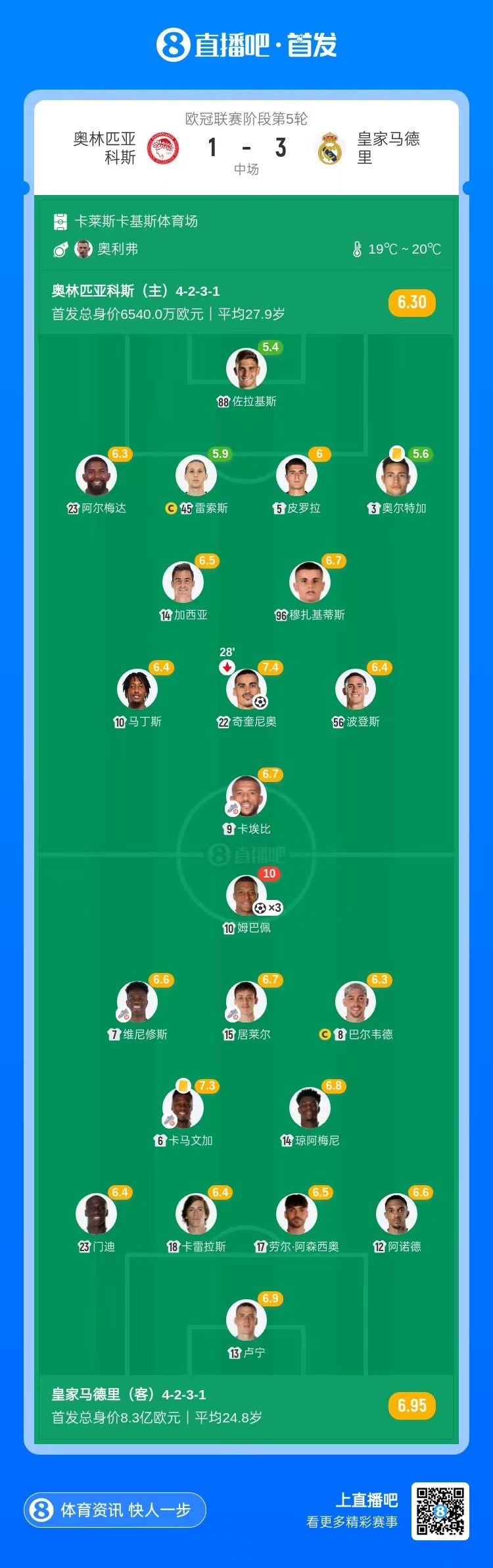 11月27日讯 北京时辰4:00,欧冠联赛阶段第5轮,奥林匹亚科斯vs皇家马德里,比赛在卡莱斯卡基斯畅通场打响!上半场,奇奎尼奥匡助奥林匹亚科斯当先破门!随后姆巴佩7分钟内演出帽子戏法!维尼修斯进球被吹;琼阿梅尼远掷中横梁!半场范围,皇马暂3-1跨越奥林匹亚科斯。
