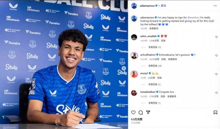 这位摩洛哥小将也通过社媒晒出我方的签约照,并配文:“我很欢叫能与埃弗顿签约,我异常期待运行重生计,为这家俱乐部奉献我的一切!埃弗顿加油!!”