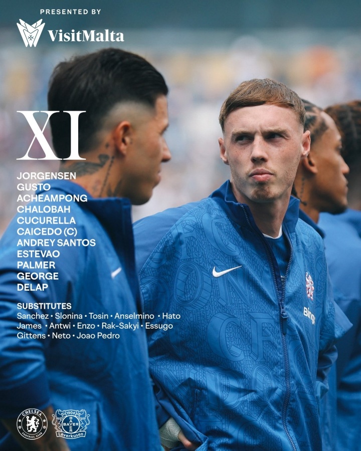 切尔西首发:约根森、古斯托、约什-阿奇姆彭、查洛巴、库库雷利亚、凯塞多、安德烈-桑托斯、埃斯特旺、帕尔默、乔治、德拉普