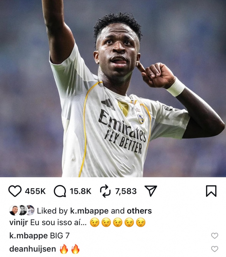 维尼修斯社媒晒照庆祝告捷,姆巴佩点赞驳倒:BIG 7