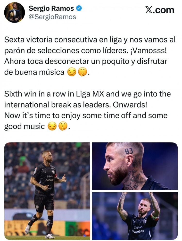 助蒙特雷联赛6连胜&榜首,拉莫斯社媒:是工夫削弱削弱,听听音乐