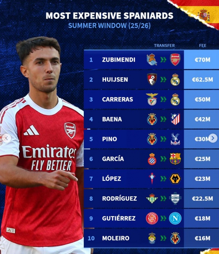 今夏西班牙球员转会费榜:苏维门迪压赫伊森居首,A费&巴埃纳在列
