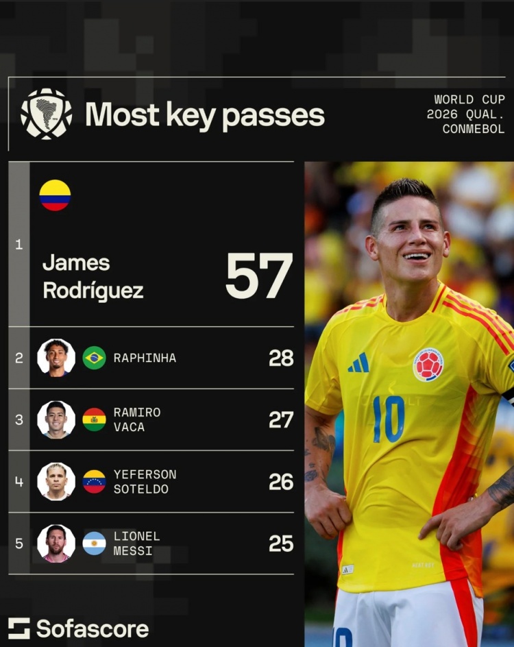 本届南好意思世初赛枢纽传球榜:J罗57次断层居首,梅西25轮番五