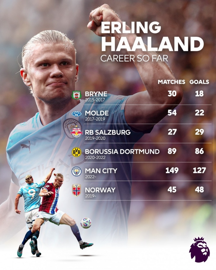 英超官方晒哈兰德进球分离:曼城149场127球,挪威队45场48球