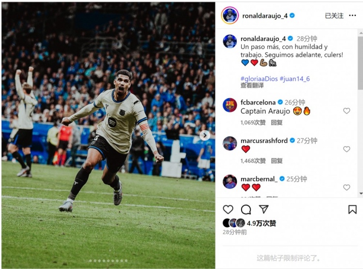 阿劳霍社媒晒照庆祝取胜,他写说念:“又迈出一步,怀着慈悲与奋力。咱们不竭前进,巴萨球迷们!”