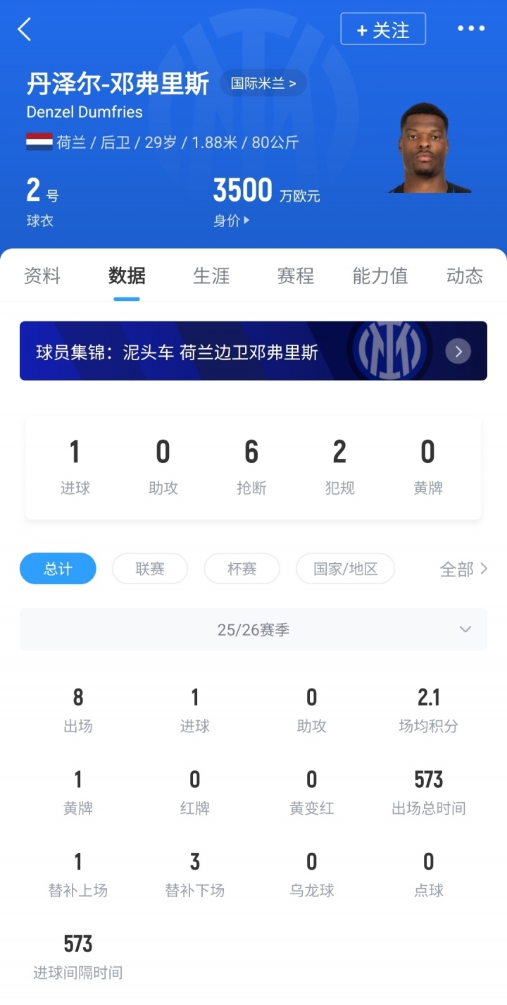 29岁的邓弗里斯本赛季代表国米出战8场比赛,打进1球,现在德回身价3500万欧。