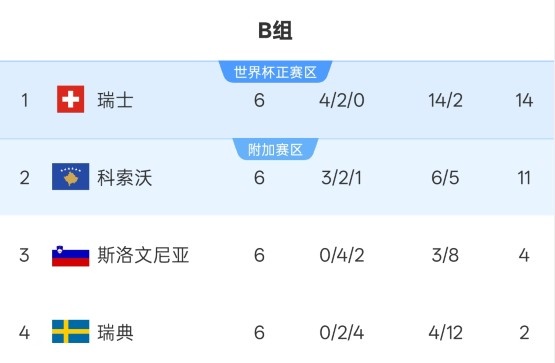 本场战罢,瑞士积14分,小组第一平直晋级来岁天下杯。科索沃仍积11分小组第二,将参预附加赛。
