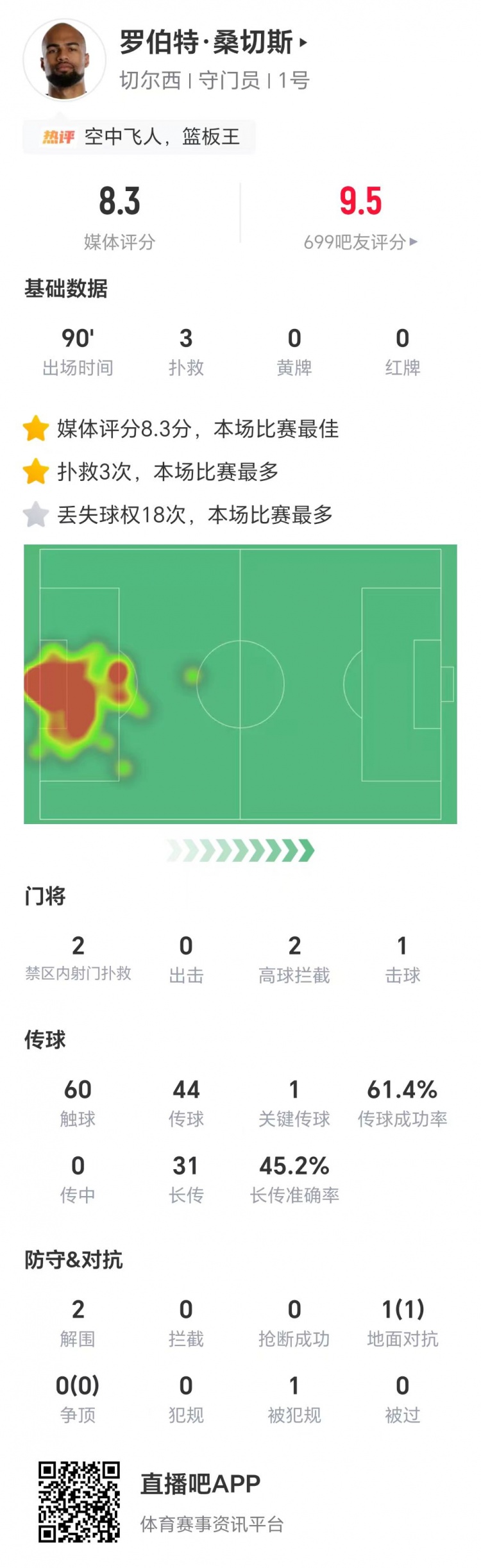 桑切斯数据:2次扑救禁区内射门,2次高球抑制,获评8.3分