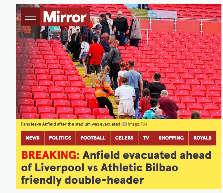利物浦与毕尔巴鄂竞技队的友谊赛将于0点开赛,球迷们驱动入场时警报响起,随后球迷被条目裁撤。现在,裁撤原因尚不了了。