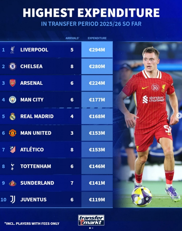 当今夏窗引援耗尽榜:利物浦签5东谈主2.94亿欧居首,前四均来自英超