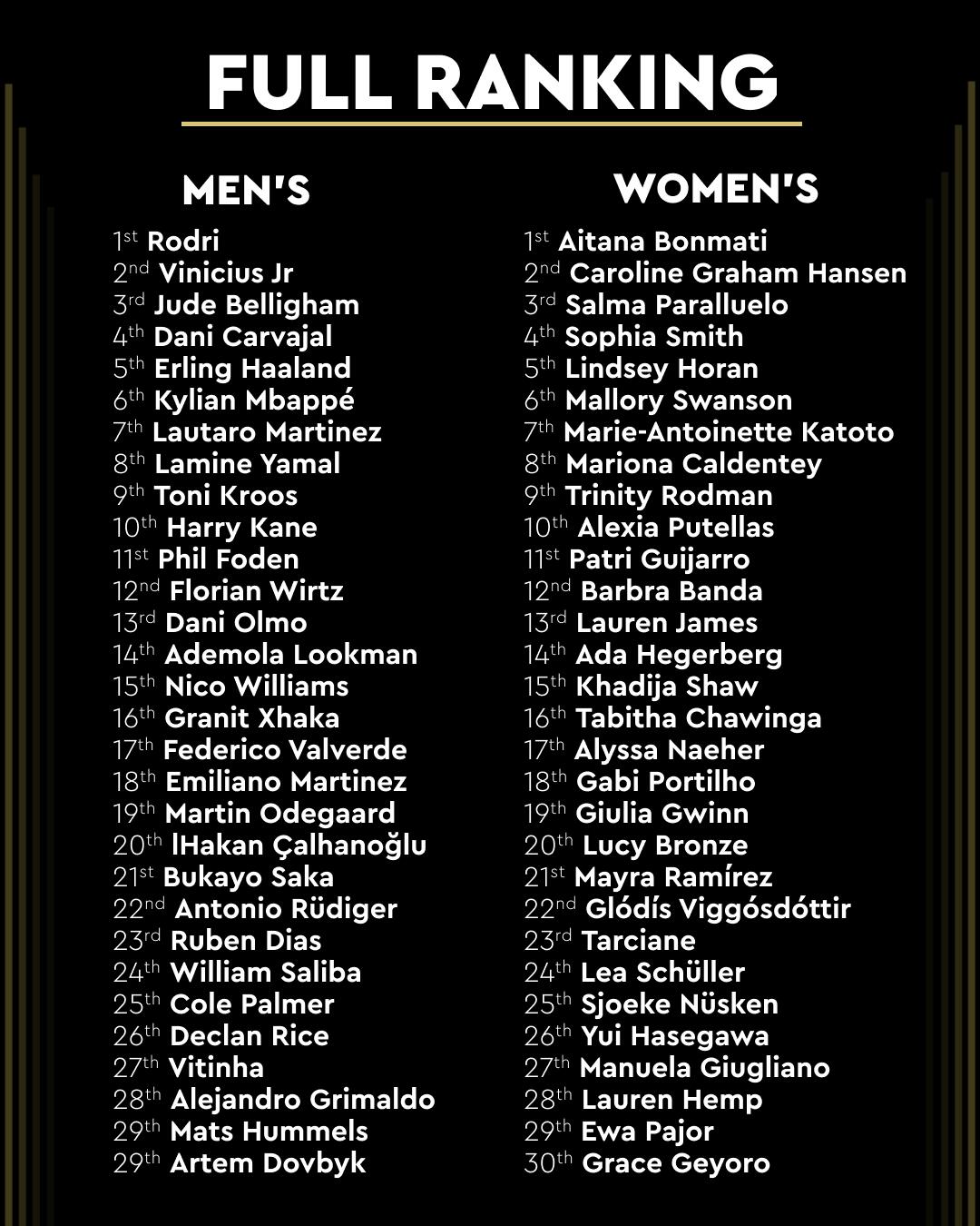 今年会是谁?回顾去年金球奖排名:罗德里夺魁,维尼修斯第二