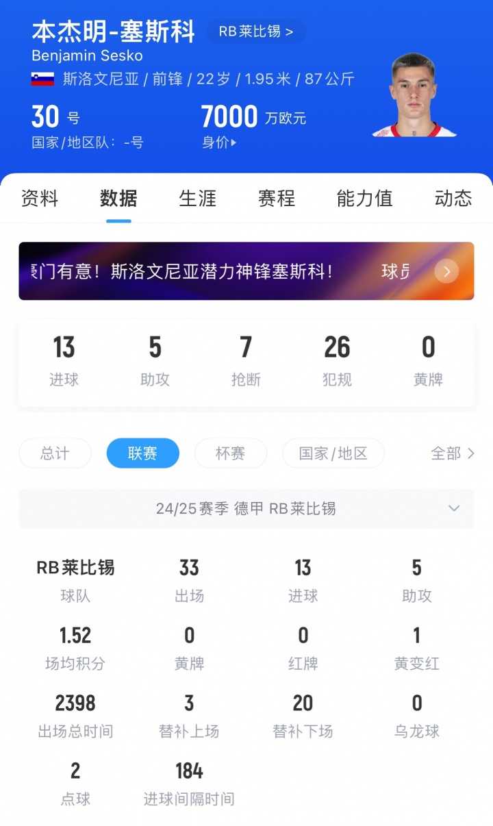 塞斯科现年22岁,上赛季为莱比锡出场45次,取得21粒进球和6次助攻,他与莱比锡现有的合同2029年到期,目前球员德转估值7000万欧。