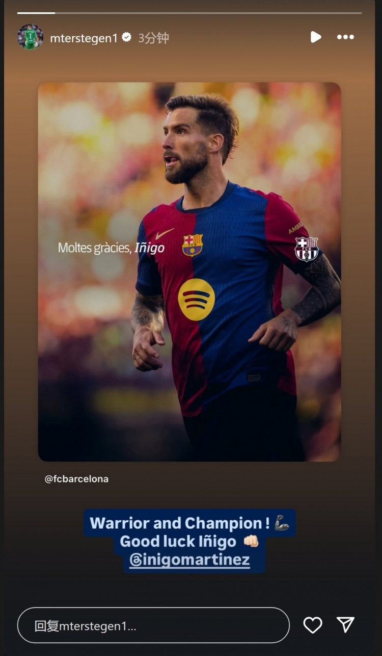 特尔施特根社媒告别伊尼戈:勇士与冠军,祝你好运👊