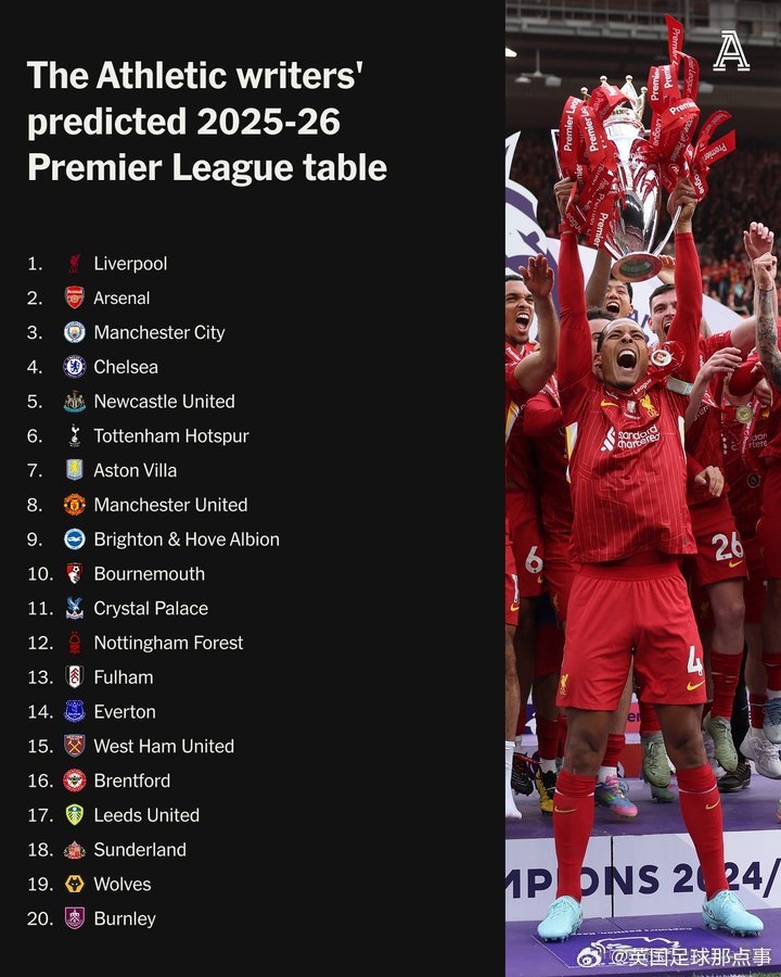 TA预测新赛季英超排名:利物浦夺冠,枪手曼城分列二三,曼联第8