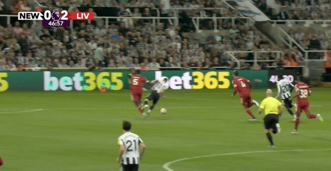 这一画面发生于第47分钟,当时利物浦多打一人2-0领先。纽卡反击,巴恩斯前插,科纳特补防,前者倒地,裁判未吹罚,VAR未介入,吉马良斯抗议判罚因此吃到黄牌。