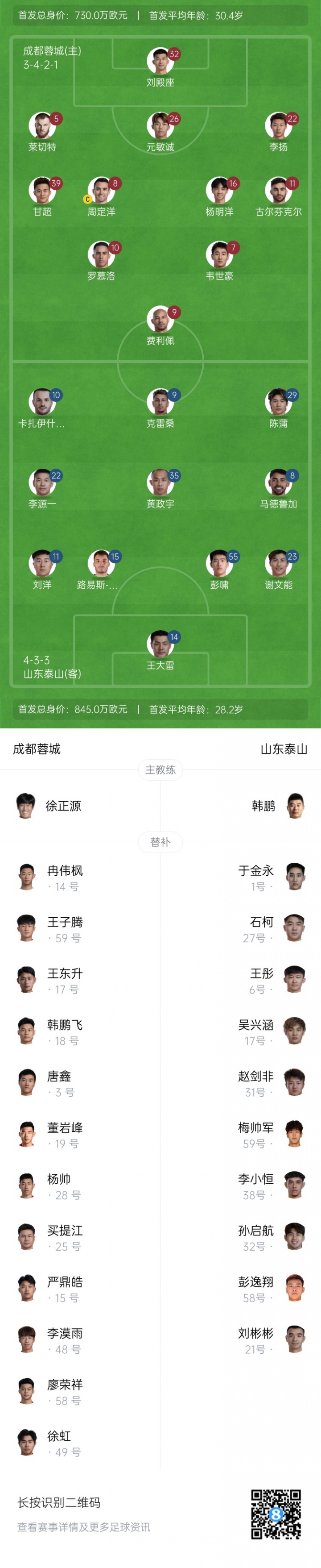 蓉城vs泰山首发:4外援对决,韦世豪先发,马德鲁加、陈蒲出战