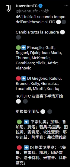 11人全换!尤文季前赛下半场替换11人:马里奥首秀,DV9登场