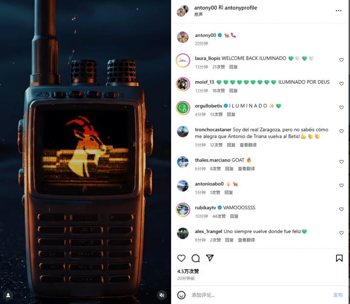 “GOAT”要来了!安东尼社媒预热加盟贝蒂斯:🐐📞