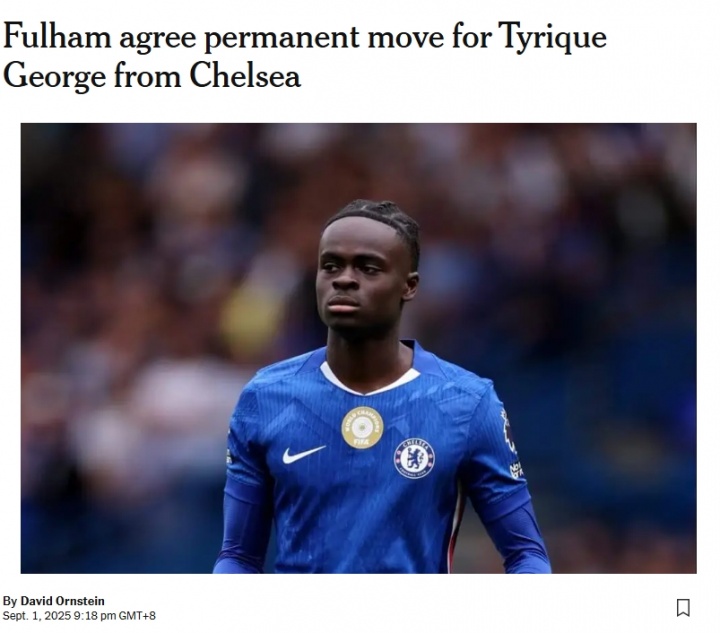 奥恩斯坦表示,乔治将以永久转会形式从切尔西加盟富勒姆。这笔交易的总额达到2200万英镑,并包含二次转会分成条款。富勒姆已与球员就五年合约达成协议,后续将安排体检。