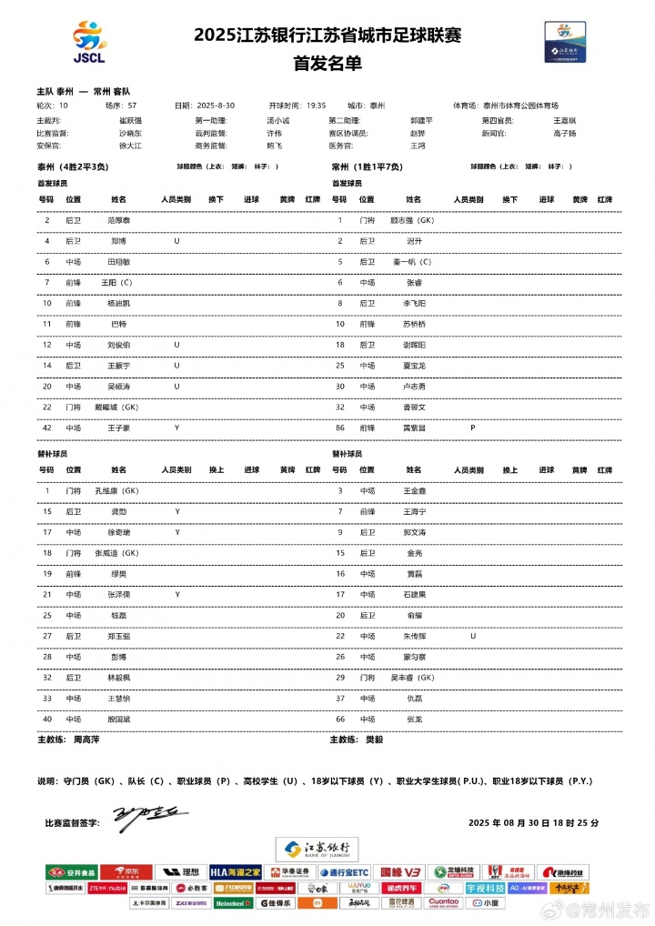 根据赛前公布的首发名单显示,现中超河南队球员黄紫昌代表常州队首发出战,上演个人在“苏超”的首秀!