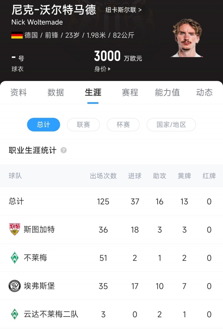 08月30日讯 官方消息,纽卡斯尔从斯图加特签下23岁的沃尔特马德,德转数据显示,沃尔特马德的转会费为8500万欧元。