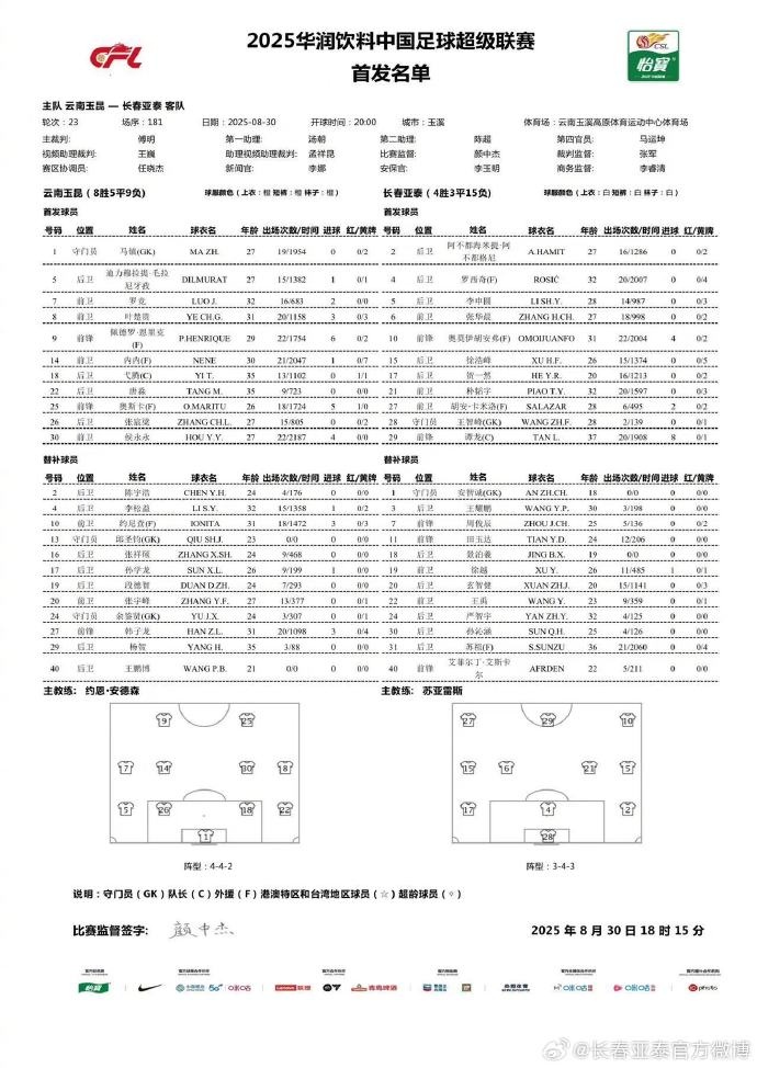 云南玉昆vs长春亚泰 首发出炉,为长春我们一起战斗