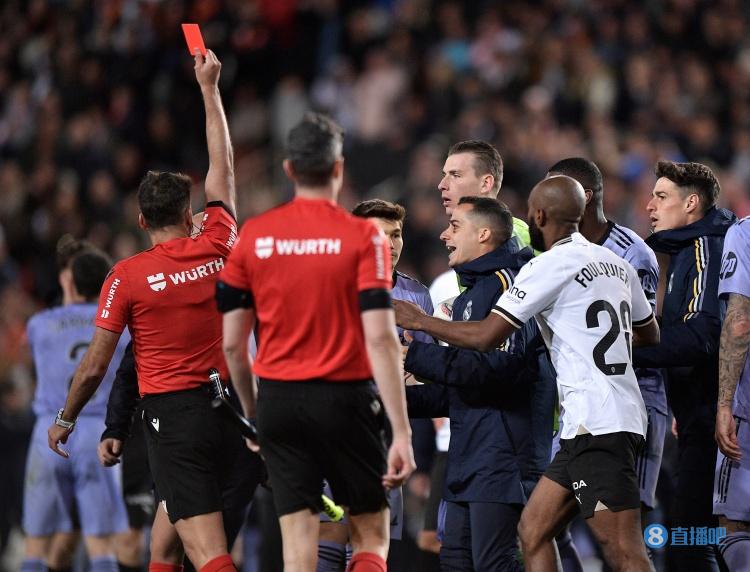 2023/24赛季西甲第27轮,皇马2-2战平瓦伦西亚最后时刻,贝林厄姆破门,但主裁提前吹响终场哨。皇马集体抗议,贝林厄姆对裁判出言不逊,被主裁判希尔-曼萨诺直红罚下。