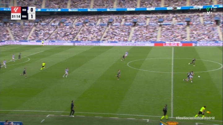 Archivo VAR:VAR在皇家社会vs皇家马德里比赛中出现失误。赫伊森抓住并推倒了奥亚萨瓦尔,但他并非最后一人。这不是直红。此外,前锋处在的位置绝不可能被视为明显的进球机会。
