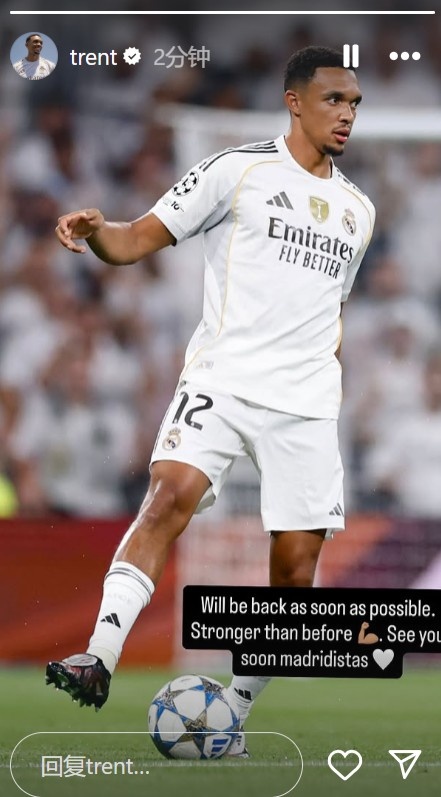 阿诺德写道:“我会尽快回归,变得比以前更强💪🏽。很快再见,皇马球迷们。”
