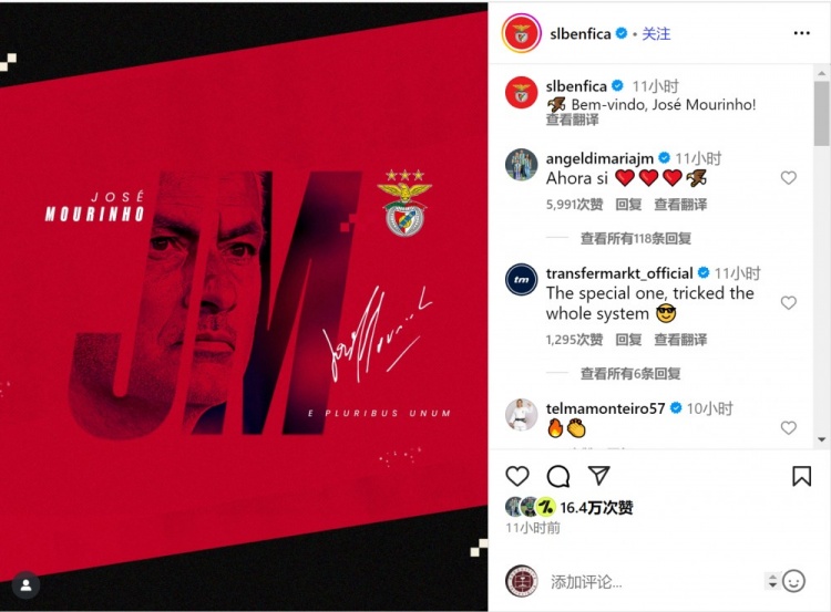 本菲卡社媒官宣穆帅执教,迪马利亚留言:终于成了❤️🦅