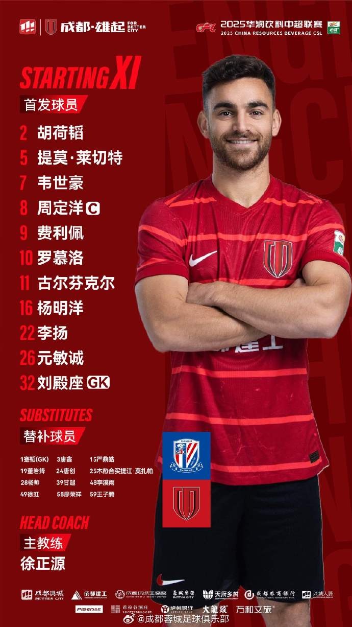 上海申花vs成都蓉城 比赛首发名单出炉!成都,雄起!