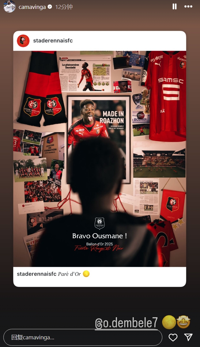 与登贝莱同样出身雷恩青训的卡马文加转发了雷恩的海报祝贺登贝莱获奖。